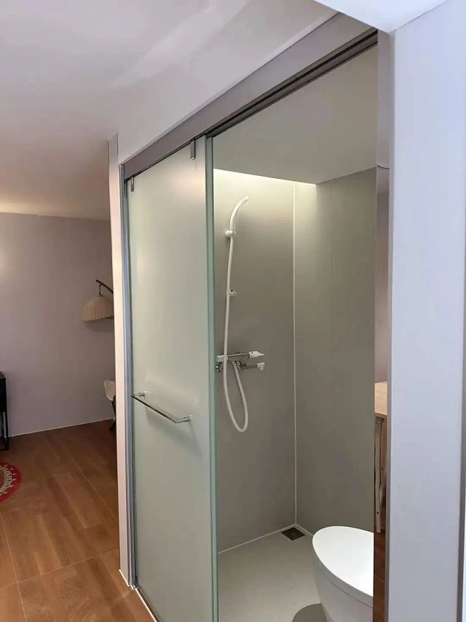 厕所位置装的是折叠的浴帘,洗澡时围合,不用时拉开,还能让水汽快速排出,适合日常生活的装修方案!