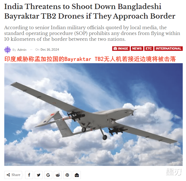 据印媒报道,印度军方高级官员表示,如果孟加拉国操作的土耳其产TB-2无人机飞得离印孟两国边境太近的话,印度会考虑将其击落;这位官员给出的理由是印军禁止两国间距离边境10公里范围的任何无人机飞行。