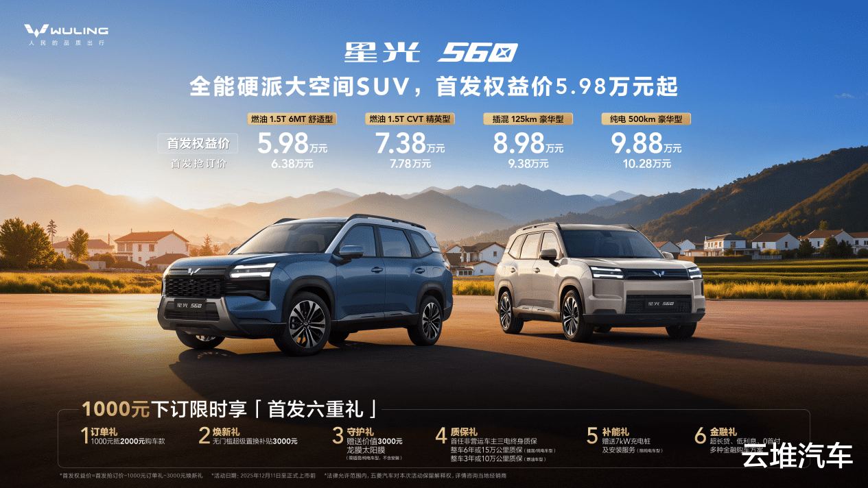 今日,「全能硬派大空间SUV」——星光560正式亮相2025东盟国际车展,并同步全球线下首发。新车共推出四款车型配置:燃油1.5T 6MT舒适型、燃油1.5T CVT精英型、插混125km豪华型及纯电500km豪华型。为回馈用户,五菱带来了更硬的首发权益价,对应四款配置分别为5.98万元、7.38万元、8.98万元和9.88万元,原首发抢订价为6.38-10.28万元。