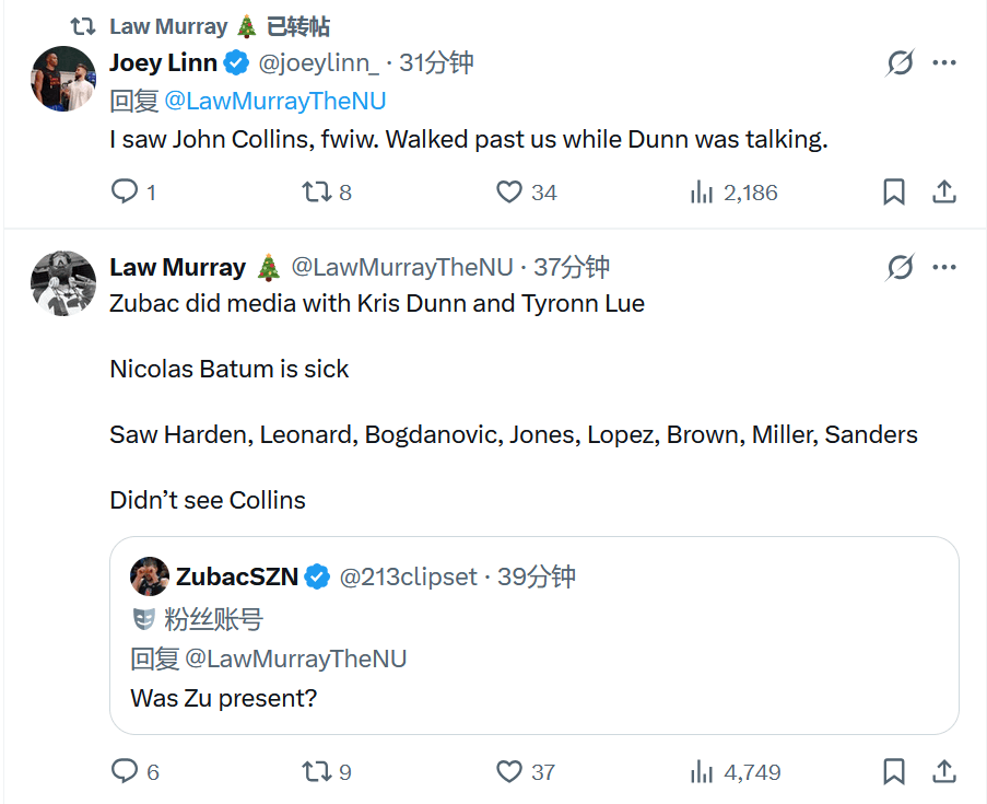 另一位快船随队记者Joey Linn更推表示:“我看到了约翰·科林斯,邓恩讲话的时候,他从我们身边走过。”