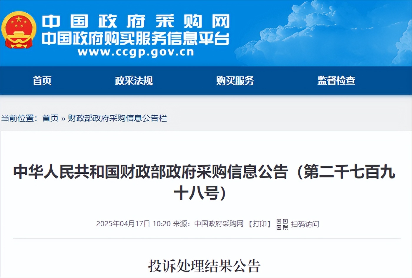 第二千七百九十二号公告显示,投诉人北京某科技股份有限公司因对国采中心就内蒙古自治区巨灾防范工程通用信息化设备采购项目作出的质疑答复不满,向财政部提起投诉。投诉事项:该项目符合性审查错误。