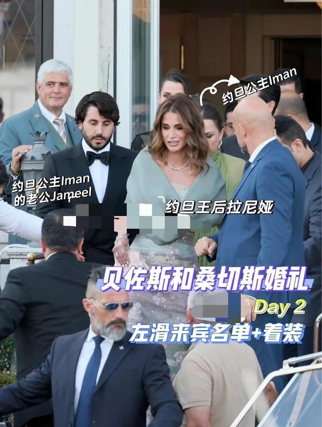 除了新娘和新郎这场秀场的绝对主角,宾客名单也一水儿地拉满:玫瑰粉色袭身的约旦王后一进场就自带满级气场;