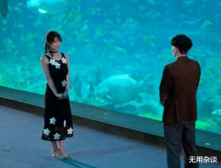 在表白环节,美园和花站在巨大的水族馆前,背景是一整面湛蓝的玻璃水槽,鱼群穿梭、光影流动,气氛浪漫却带点紧张。