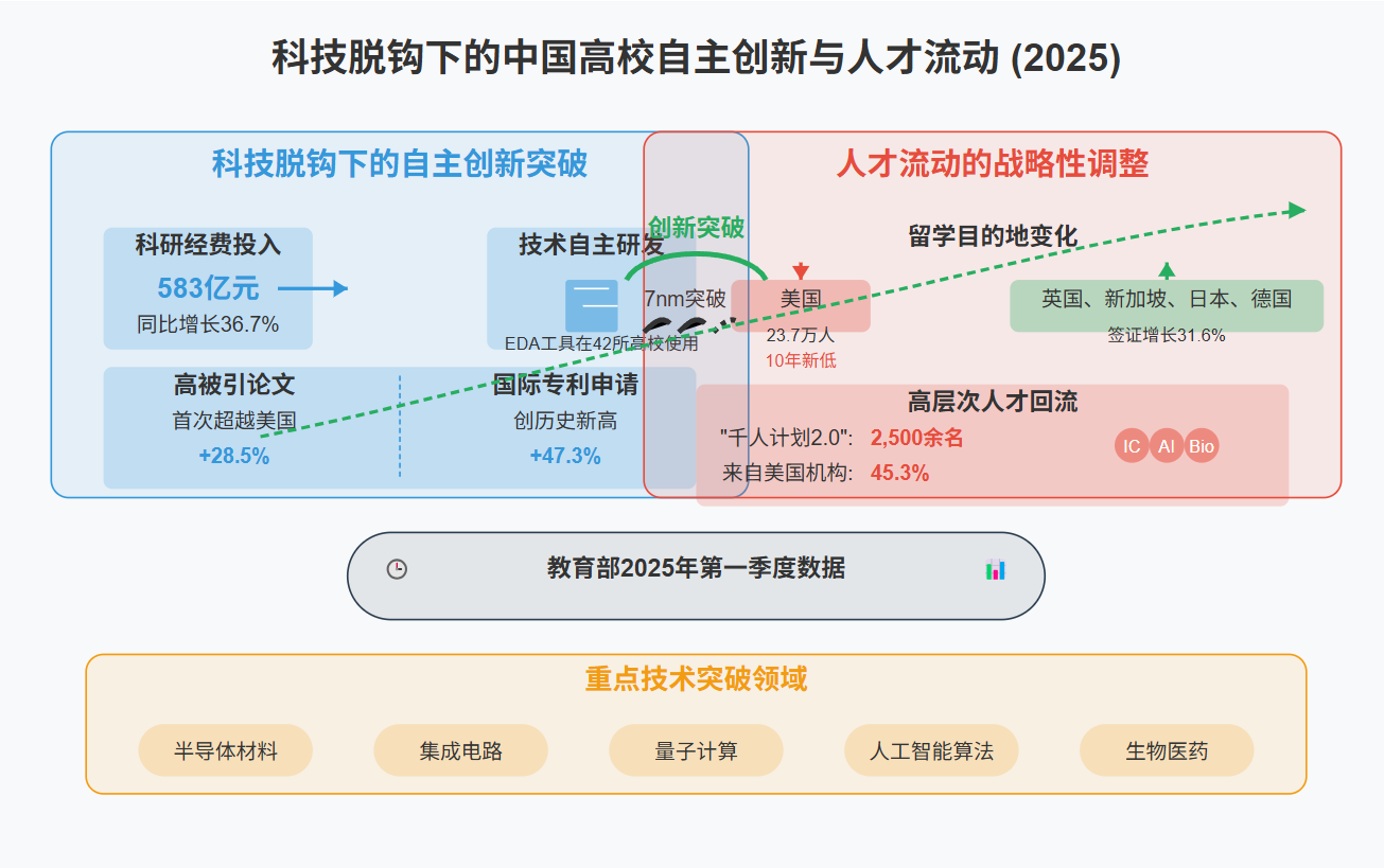 高层次人才回流成为亮点。"千人计划2.0"吸引了2,500余名海外高层次人才回国,其中45.3%来自美国顶尖机构。他们主要分布在集成电路、人工智能、生物医药等核心技术领域,为国内高校注入新活力。