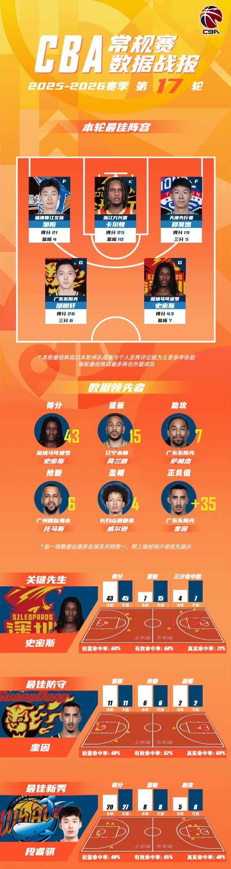 截至目前,CBA常规赛第17轮已经全部结束,官方公布了第17轮的最佳阵容,广东男篮胡明轩和天津男篮郑昊燃,本赛季首次入选。另外,媒体人也公布了北京首钢男篮的伤情更新,可以说有喜有忧。