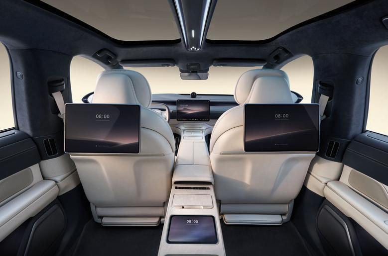 车顶有一个贯穿前后的天空桥,具备非常漂亮的纵向灯带。这个灯带和下面的行政岛,把车舱空间分成左右两个区域。
