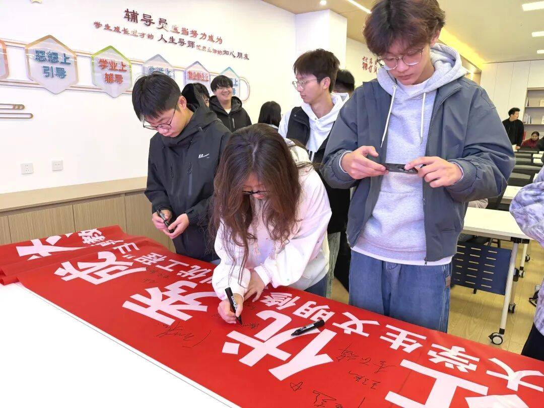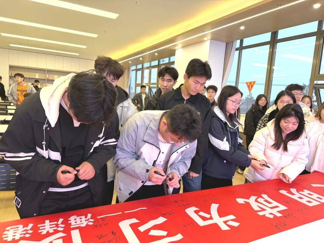 在集体承诺环节,同学们有序在“学风建设承诺书”上郑重签名,一笔一划承载着对勤学、善学、乐学的坚定追求,密密麻麻的签名既是对文明修身的认同,更是对优良学风的践行。集体合影环节,师生们以“追光逐梦,一路生花”展板为背景整齐列队,笑容中满是对学风建设的信心与期待,背景里现代化教学楼与鲜红横幅相映,彰显出学院传承治学传统、创新育人模式的坚定决心。
