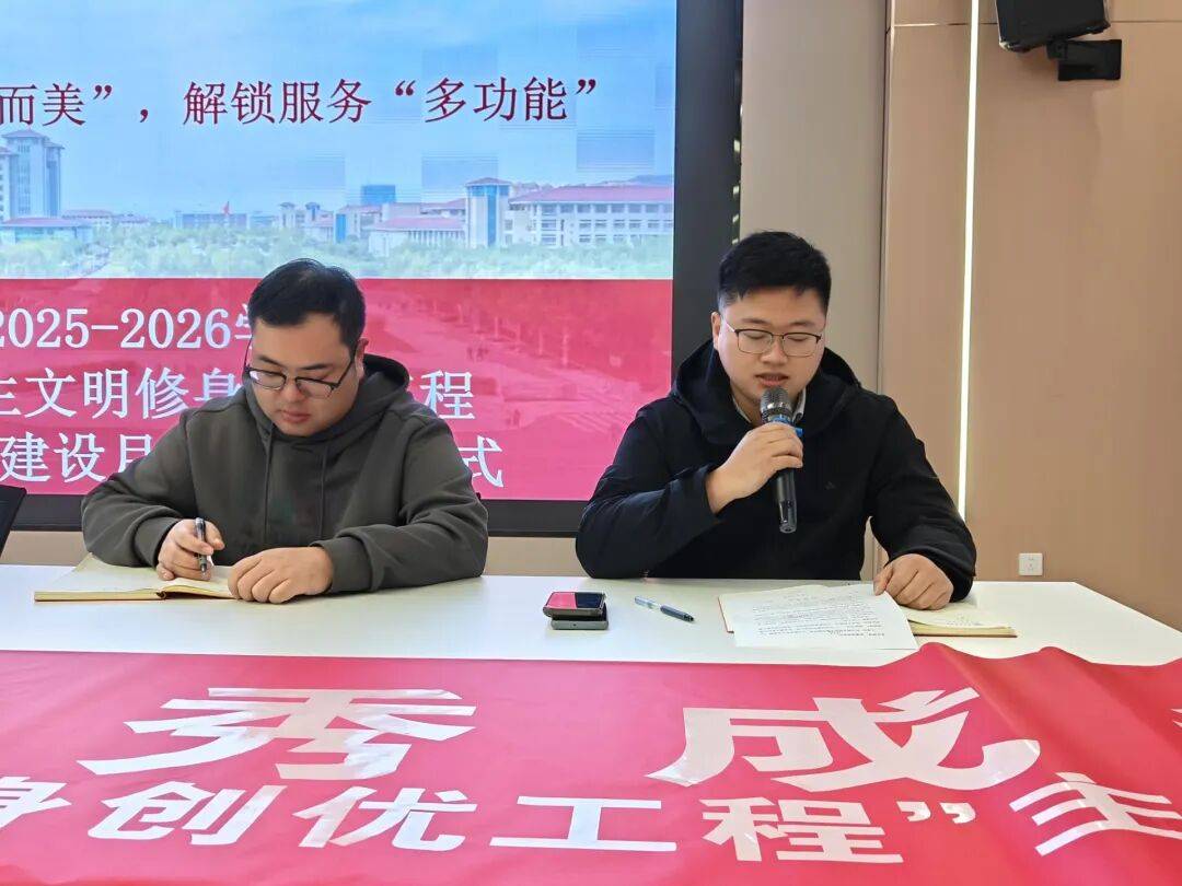 11月14日下午,海洋港口学院“大学生文明修身工程”暨学风建设月活动启动仪式在校大学生一站式服务中心顺利举行。活动紧扣“激活空间‘小而美’,解锁服务‘多功能’”主题,以空间赋能为抓手,以文明修身为载体,通过专题宣讲、集体承诺、主题展示等多元环节,推动文明素养培育与优良学风建设深度融合、互促共进。院党总支书记汪涛、党总支副书记匡亚茹及学工办全体老师出席活动,仪式由孙瑞泽老师主持。