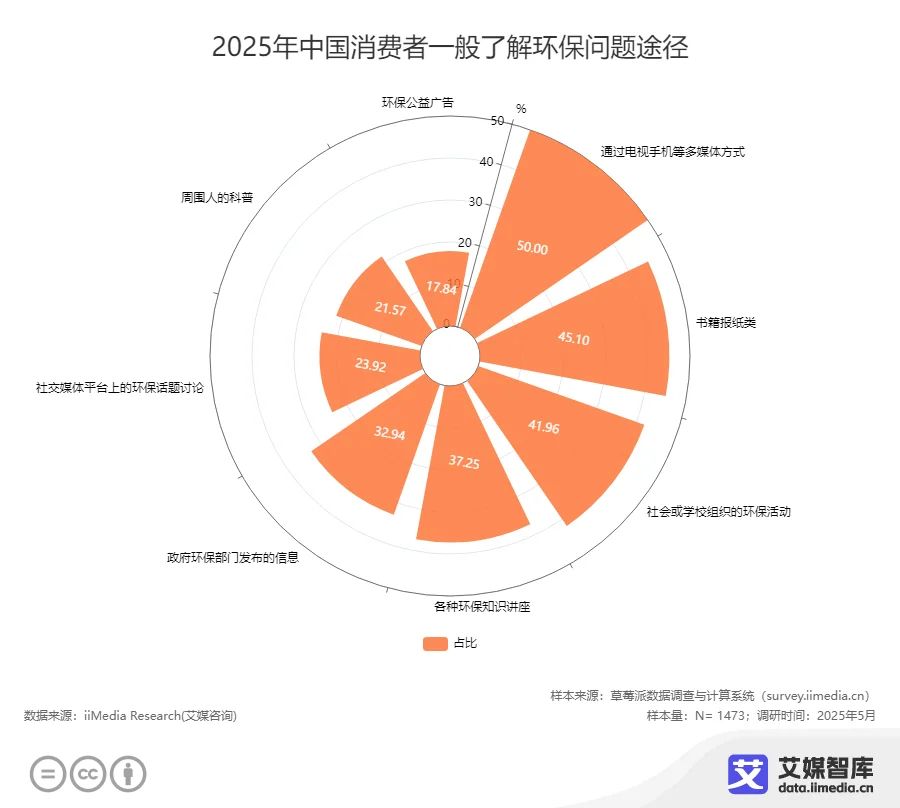 50.00%消费者会选择通过电视手机等多媒体方式了解环保问题