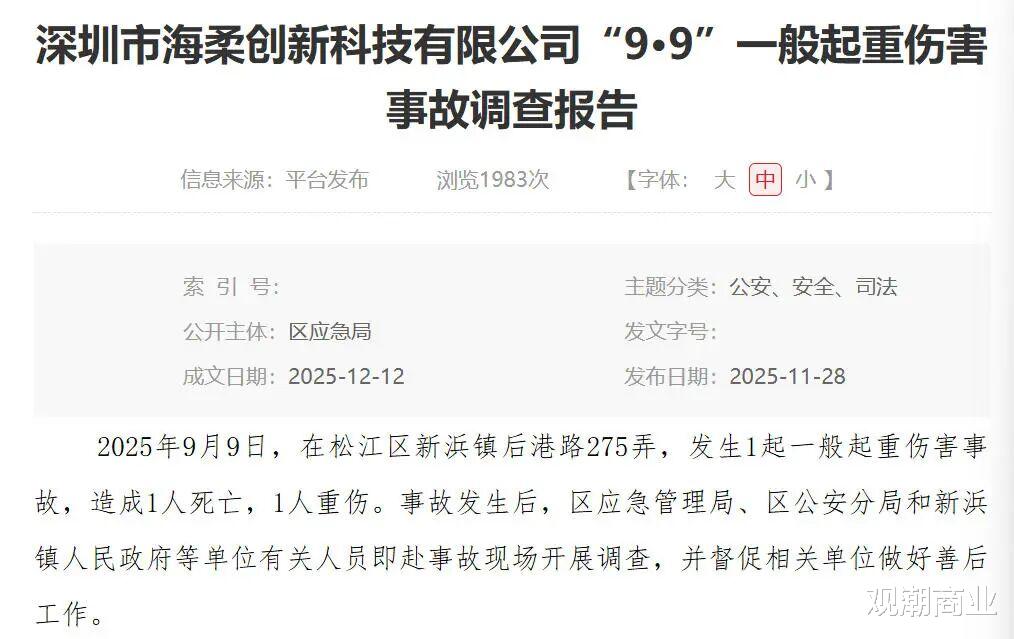 在财务与经营风险之外,2025年发生的致命生产安全事故,则直接暴露了海柔创新内控管理的重大缺陷。