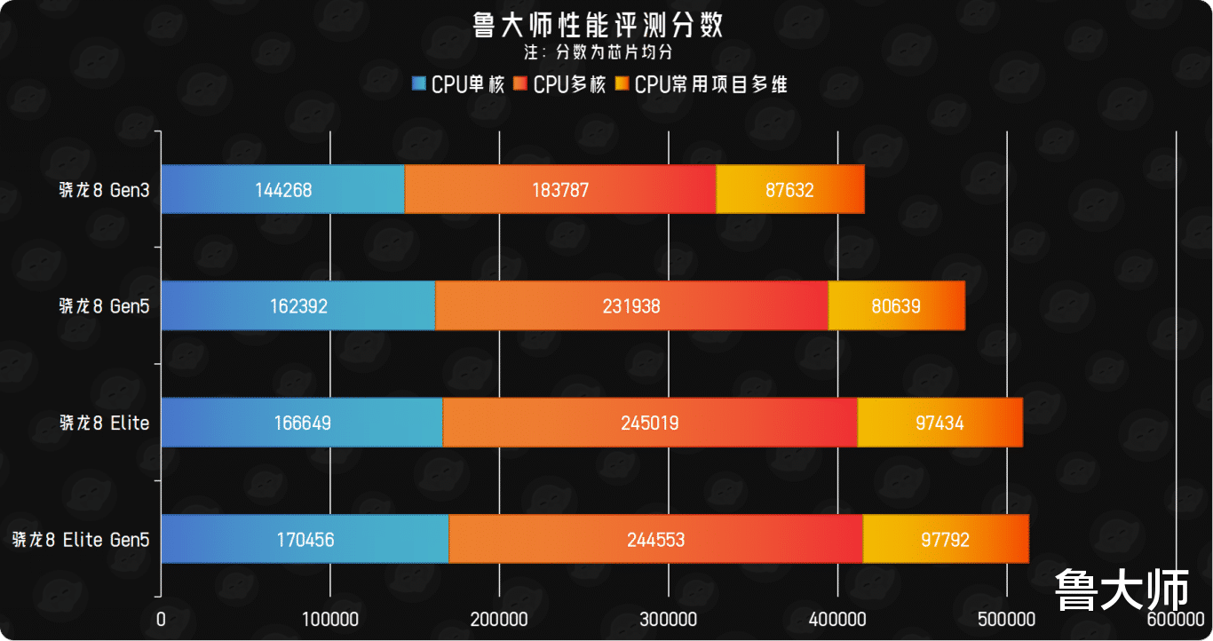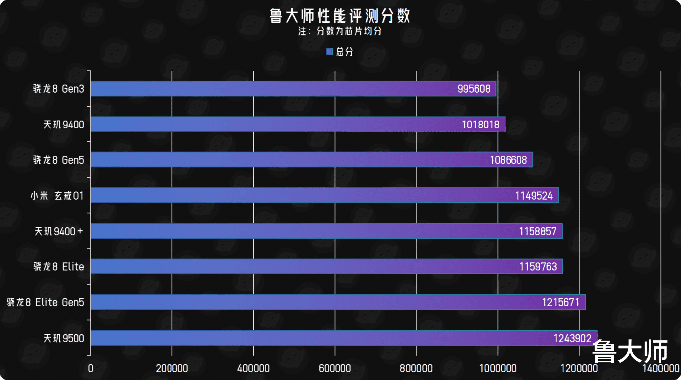 最后,再把CPU、GPU分数汇总为芯片总性能跑分,骁龙8 Gen5的1086608性能分处于天玑9400和玄戒O1之间,比天玑9400强6.7%,比玄戒O1弱5.5%。而相比上代旗舰芯8 Elite,8 Gen5则是落后其6.3%,若是再对上同宗同源的8 Elite Gen5,8 Gen5更是落后了10.6%。