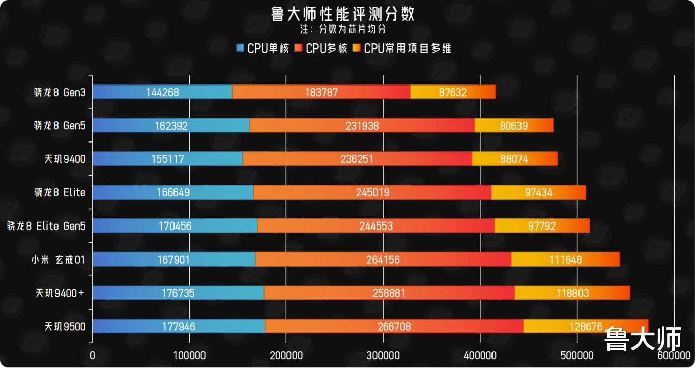 如果再把联发科天玑、小米玄戒都拉进来做竞品的话,8 Gen5的CPU单核性能跑分略微要比天玑9400强一丢丢,强出约4.7%,而CPU多核性能跑分则落后1.8%。