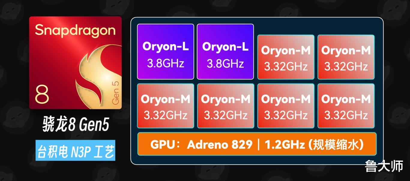 首先制程工艺方面,骁龙8 Gen5与目前旗舰芯片同为台积电第三代3nm(N3P),而且CPU也是8 Elite Gen5同款Oryon架构,核心依旧2+6组合:2×3.8GHz超大核 + 6×3.32GHz大核。
