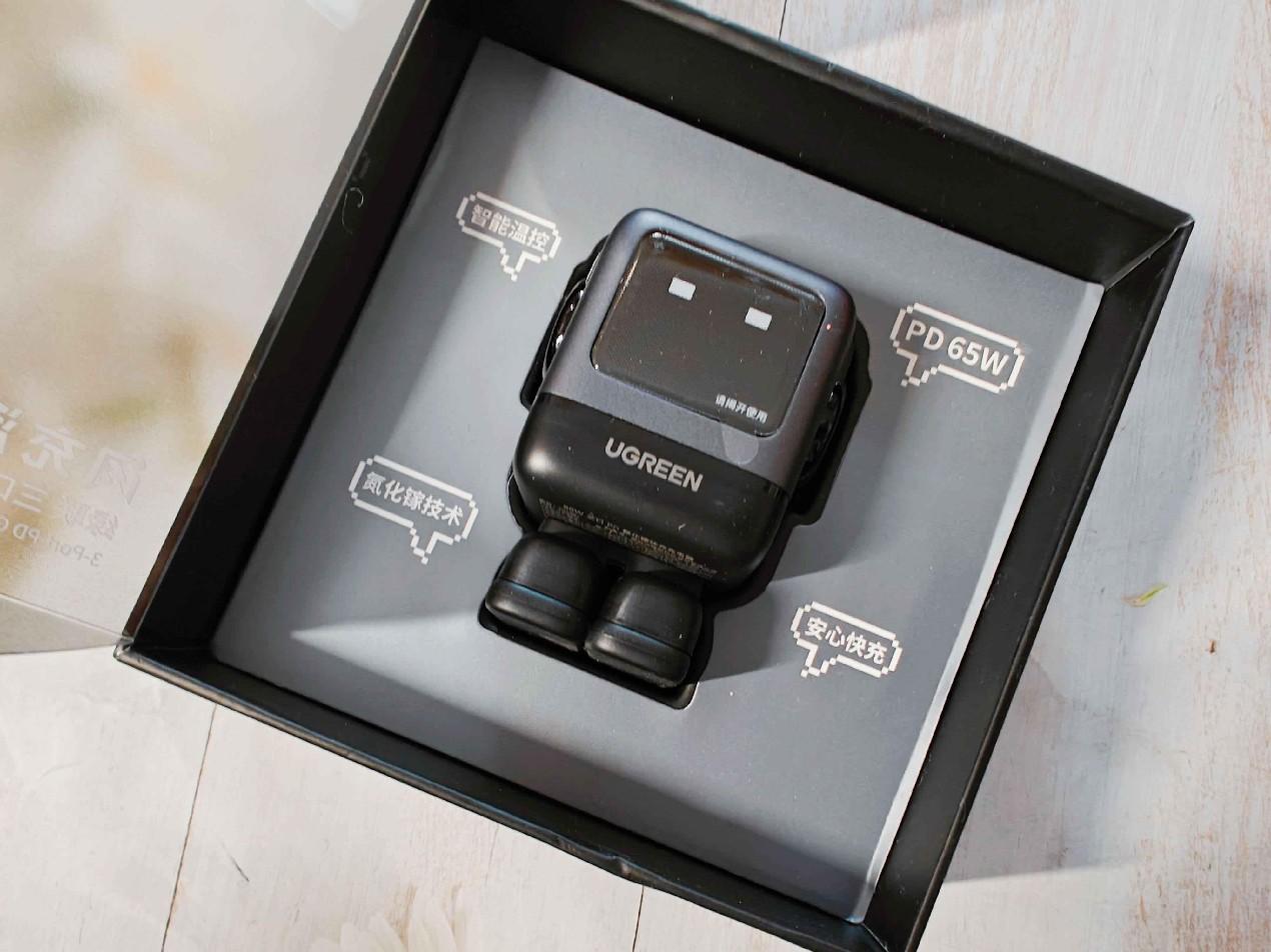 开箱外观:从第一眼心动到桌面艺术品掀开绿联Q湃快充盒盖,瞬间被其精致感所吸引,充电器本体被精心包裹着,旁边还用气泡图样标注了产品的特点。这已不是传统充电器的简陋包装,而是堪比数码潮玩的精品开箱体验。