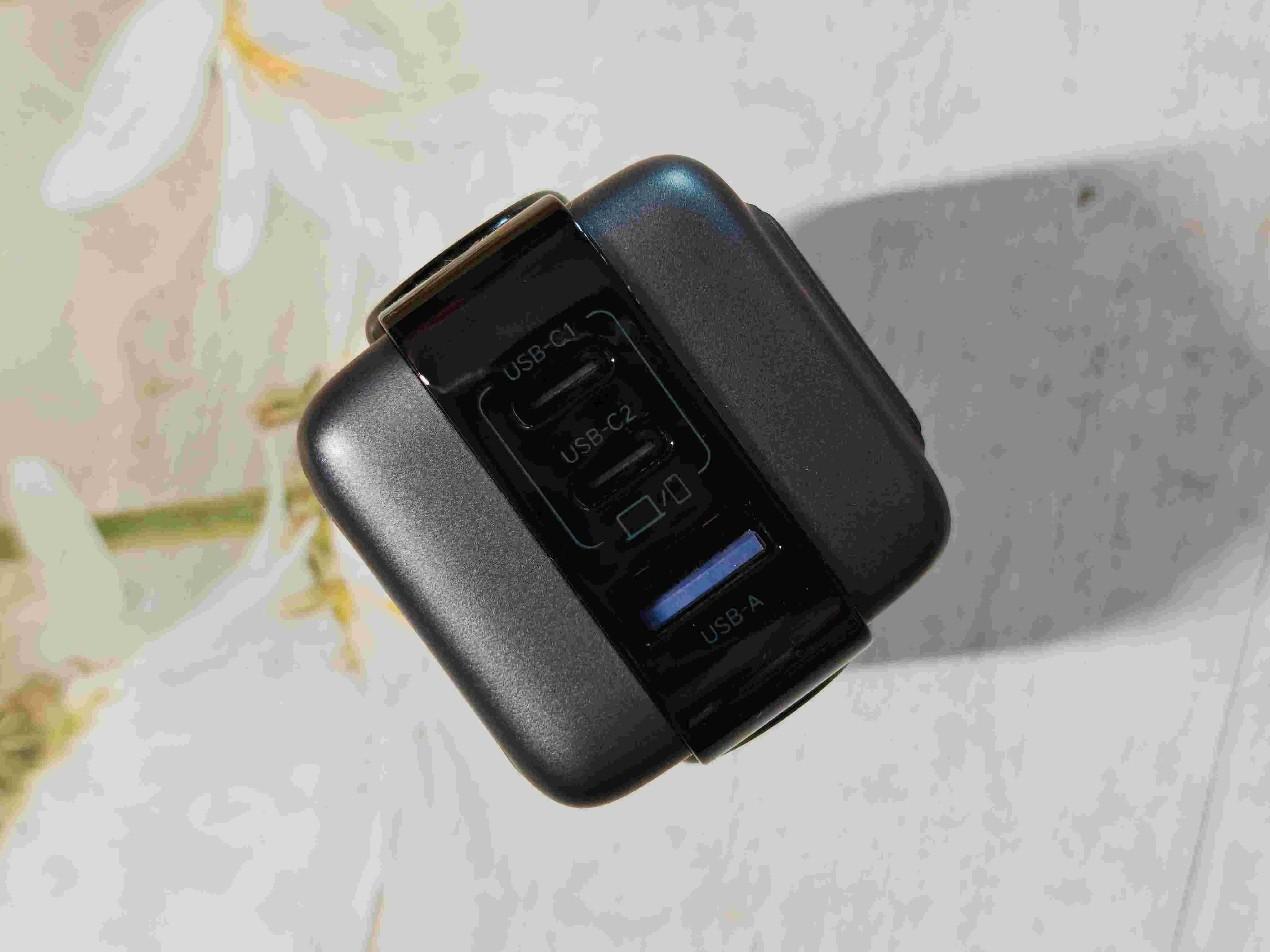 它的接口布局也是暗藏玄机,顶部2C1A黄金组合呈一字排列,接口和接口之间保持了一定的安全距离,实测同时插入三根线缆也不会互相干扰。