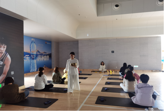 全国健身瑜伽段位四段导师张美乐手持颂钵,轻敲、摩擦、旋转,清澈的钵音如清泉漫过石阶,层层叠叠地在空间中扩散。当第一缕音浪拂过耳畔,参与者们闭目深呼吸,双肩的僵硬在音波共振中悄然松解;随着低音钵的轰鸣震动胸腔,积压的情绪仿佛找到了出口,一位企业代表感慨:“这一刻突然觉得心里空了,轻松了。”更有居民轻轻跟随钵音摆动身体,指尖无意识地划过瑜伽垫,似在回应这份来自声音的温柔疗愈。