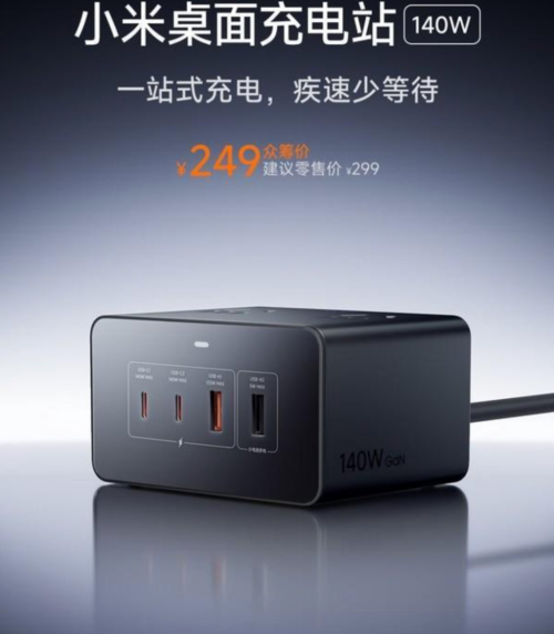 12 月 31 日消息,小米现已宣布旗下“小米桌面充电站 140W”,该产品采用 2C+2A+4AC 设计,1 月 7 日正式开启众筹,建议零售价 299 元,众筹价 249 元。