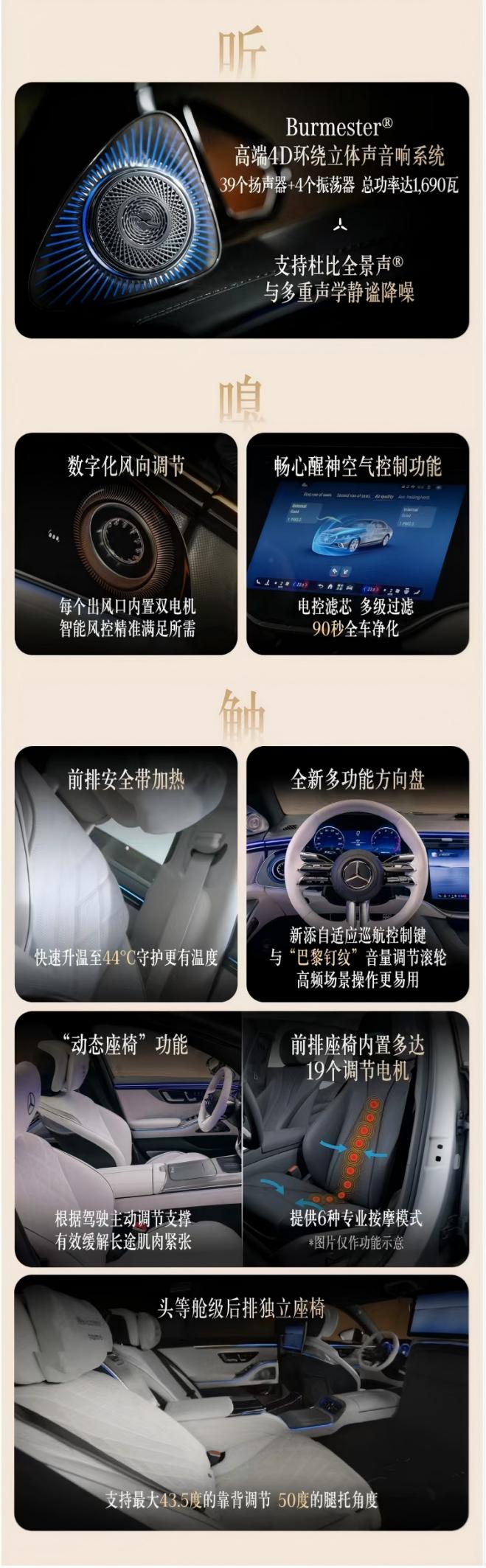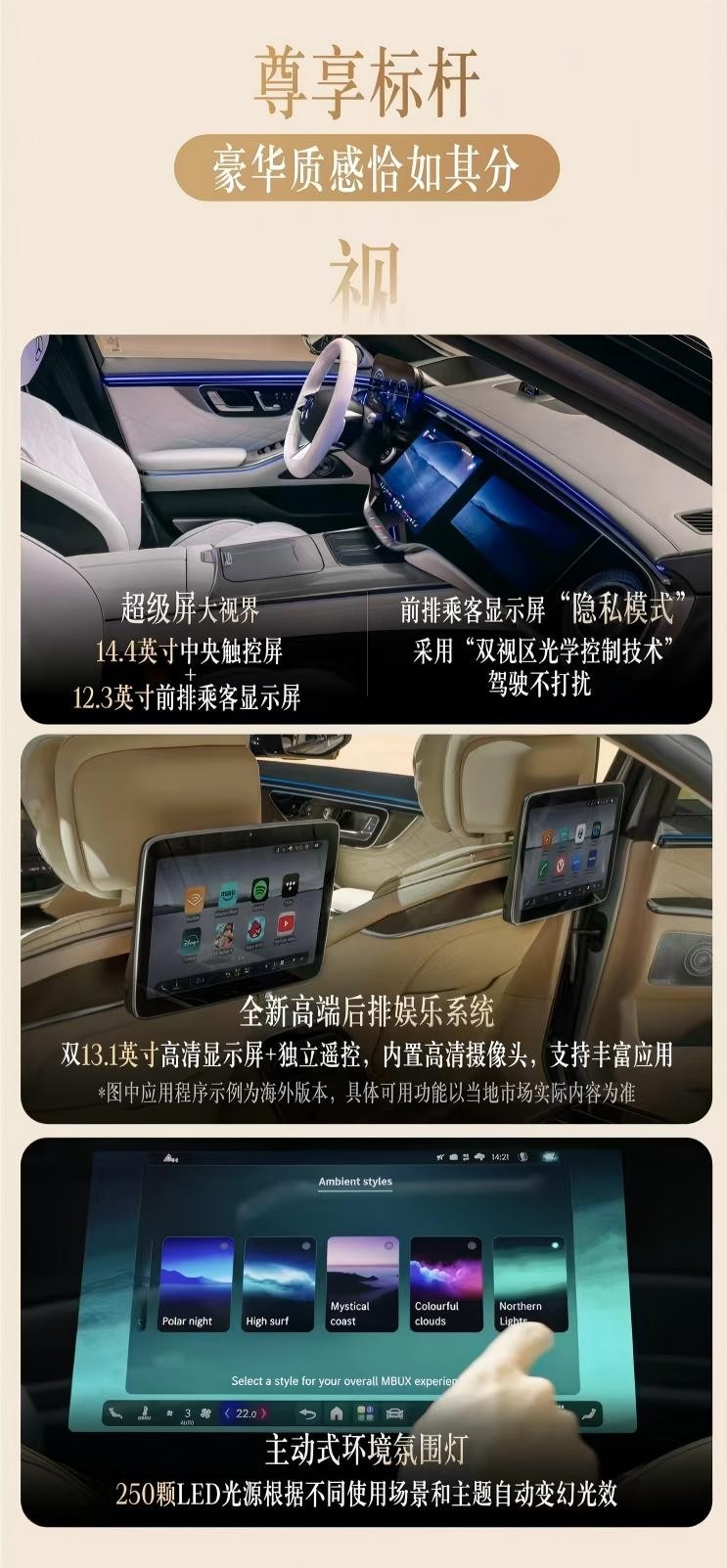 坐进车里,最直观的改变是中控台。 之前那套竖向大屏被换掉了,取而代之的是一块横贯的“MBUX超级屏”,由中控屏和副驾娱乐屏组成,科技感更现代。车机系统也升级到了自研的MB.OS架构,内置的AI助手能接入了时下最主流的AI模型。这次还有些挺有意思的“小温暖”创新,比如全球首创的前排加热安全带,天冷时能和座椅加热一起启动;氛围灯也能和顶级的柏林之声音响联动,营造更沉浸的氛围。