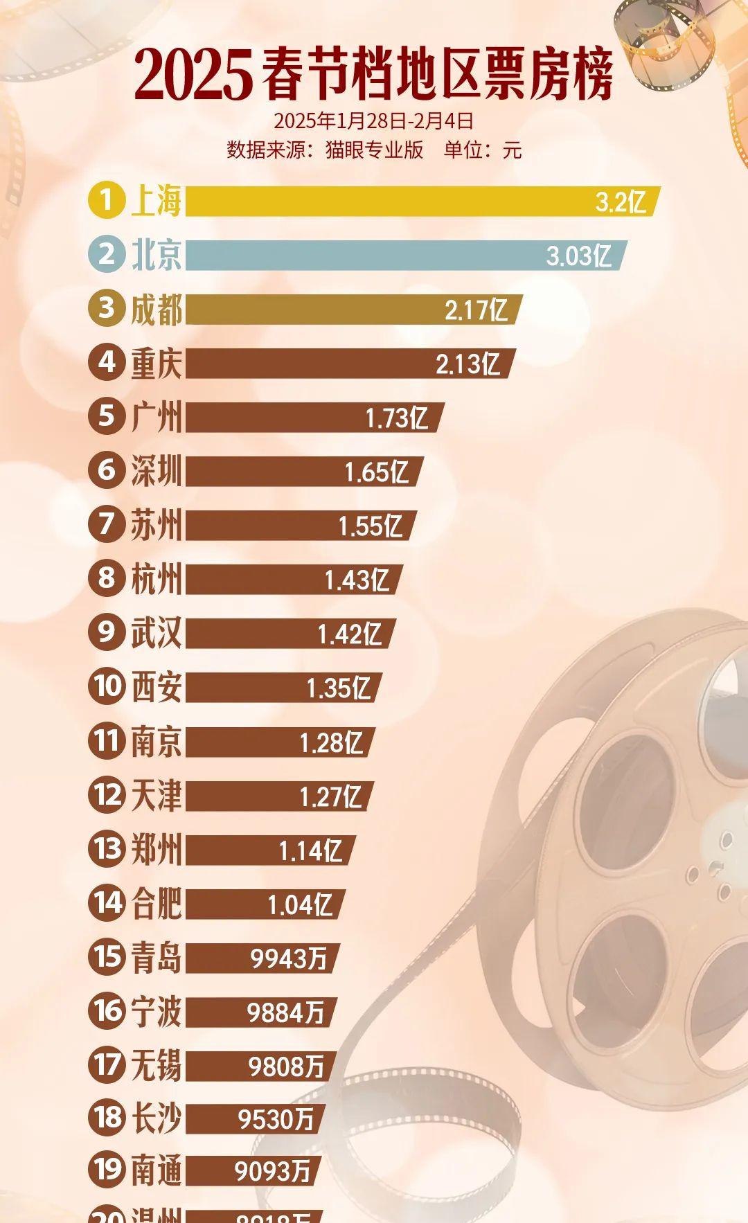 长三角地区的城市在这次春节档表现得特别突出,像苏州、南京这些城市都进入了票房前二十名,这些地方经济发达,人们对文化娱乐的需求也比较高。