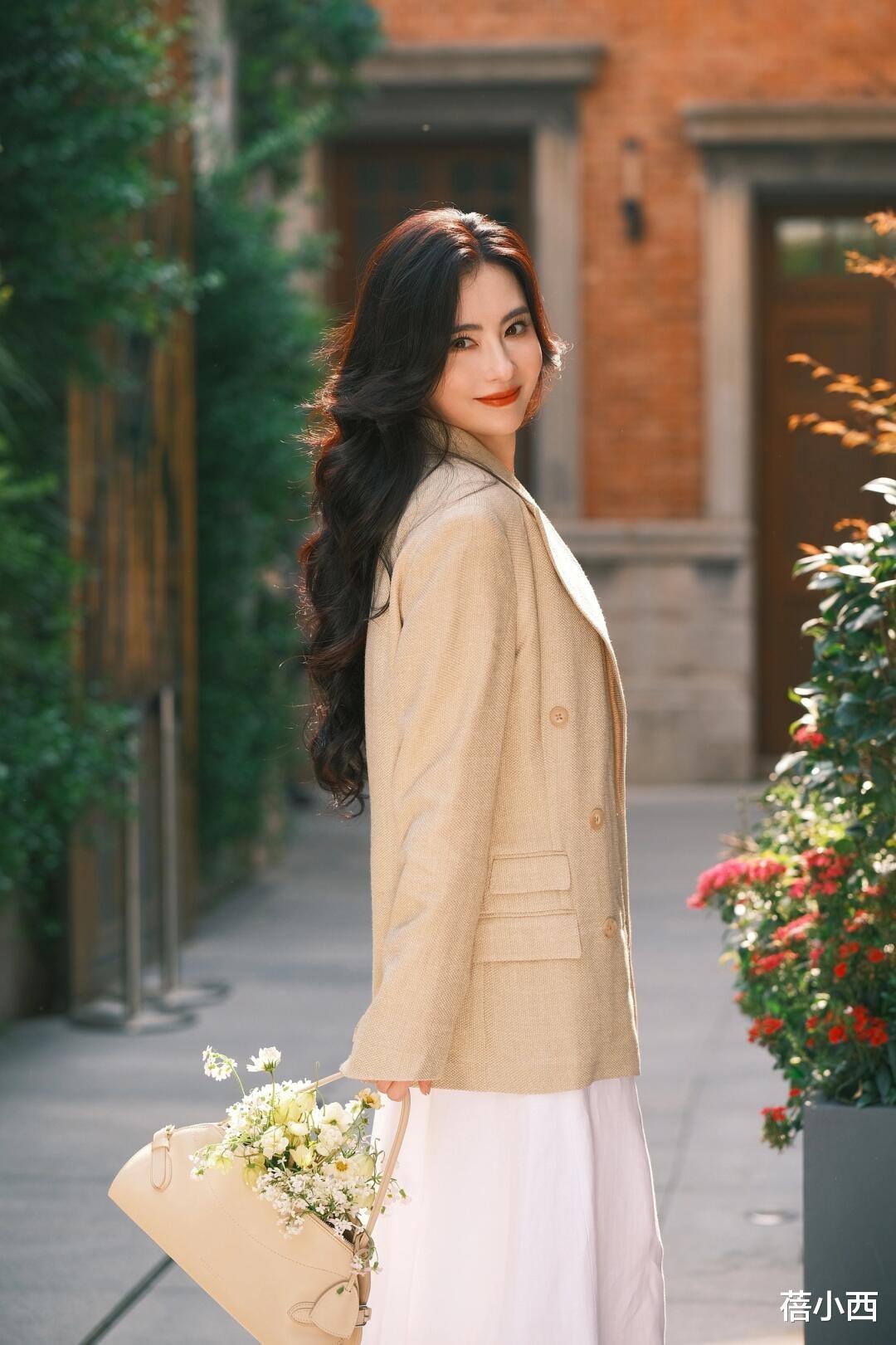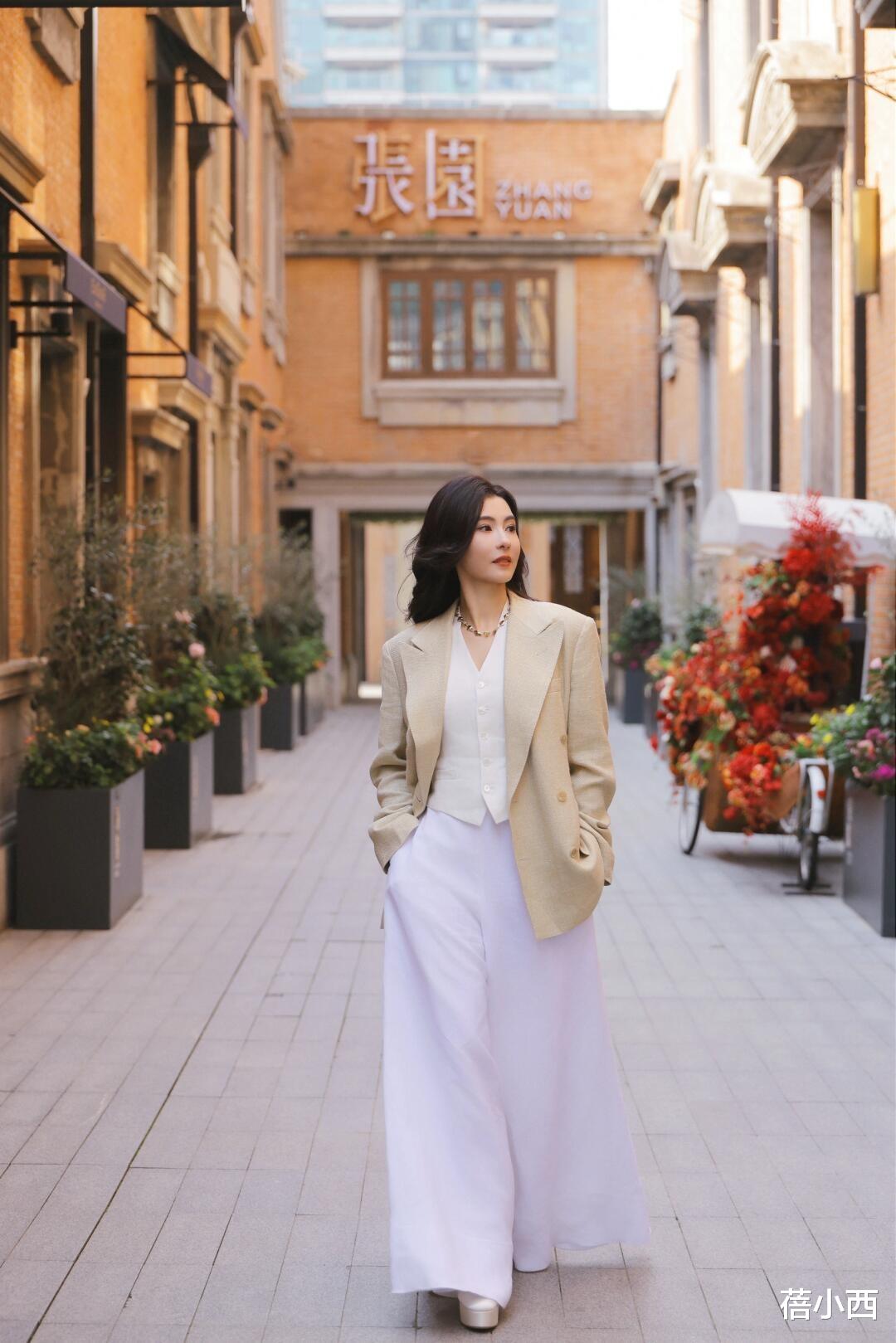 很多人穿西装外套都会在里面搭配短袖或者是吊带,可偏偏张柏芝在里面穿了一个背心,八零年代的复古风感是不是一下就来了。冷白色与米白色在层次上的渐变,也会显得整套衣服很有质感。