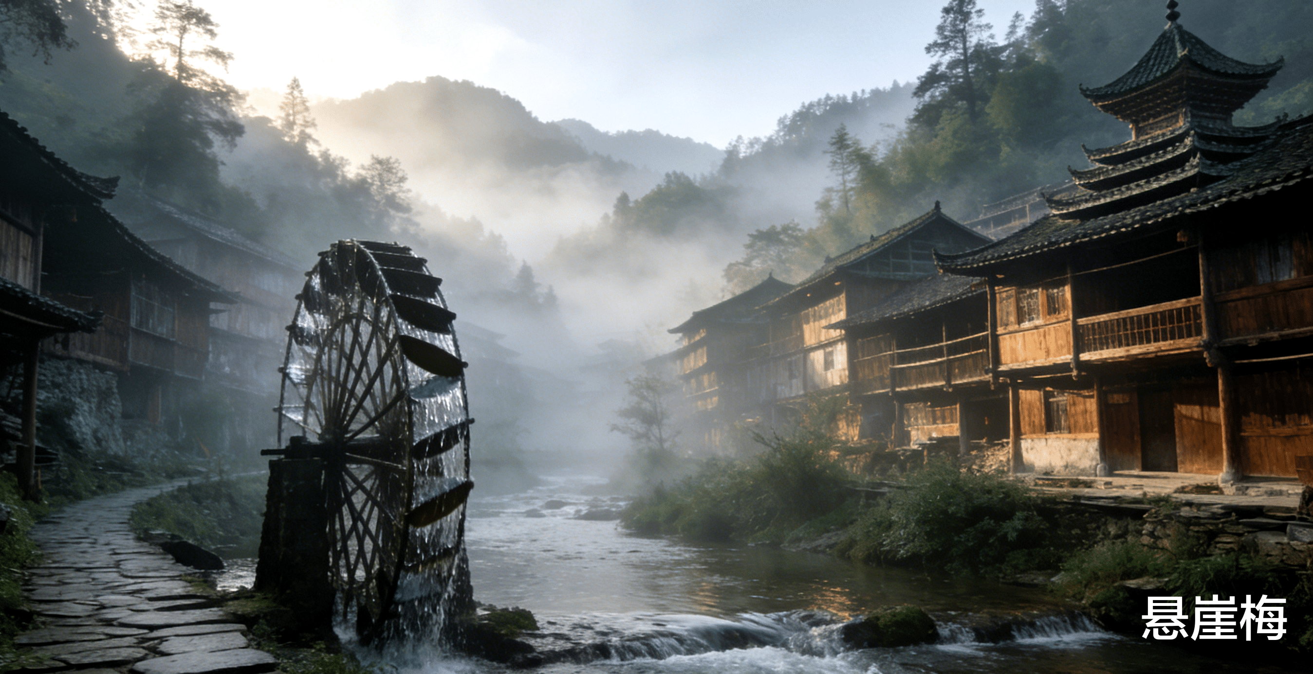 此地依山傍水,古木参天,一栋栋吊脚楼依山而建,青瓦木墙在晨雾里若隐若现。寨中清溪潺潺,水车吱呀呀地转,处处透着古朴安宁。