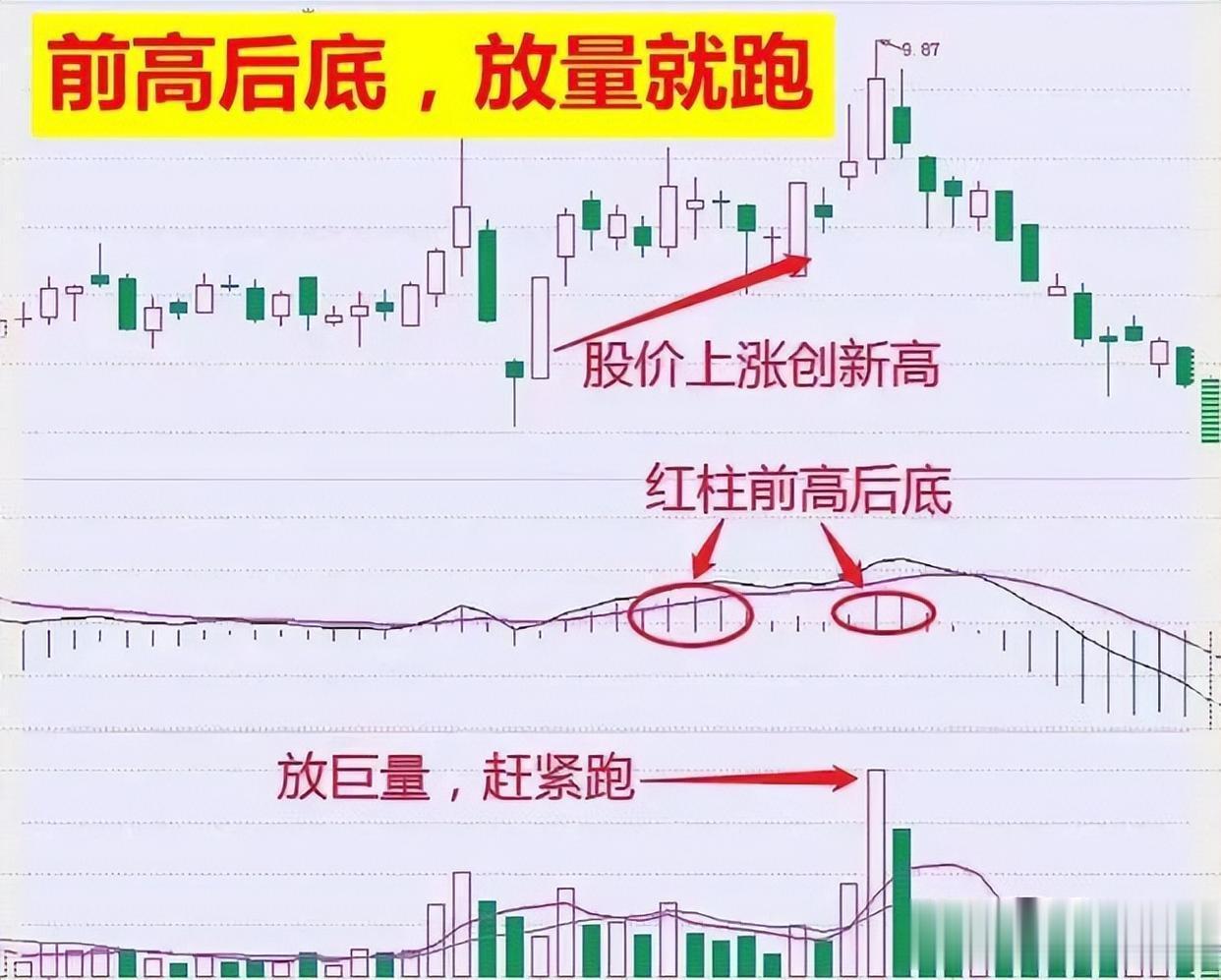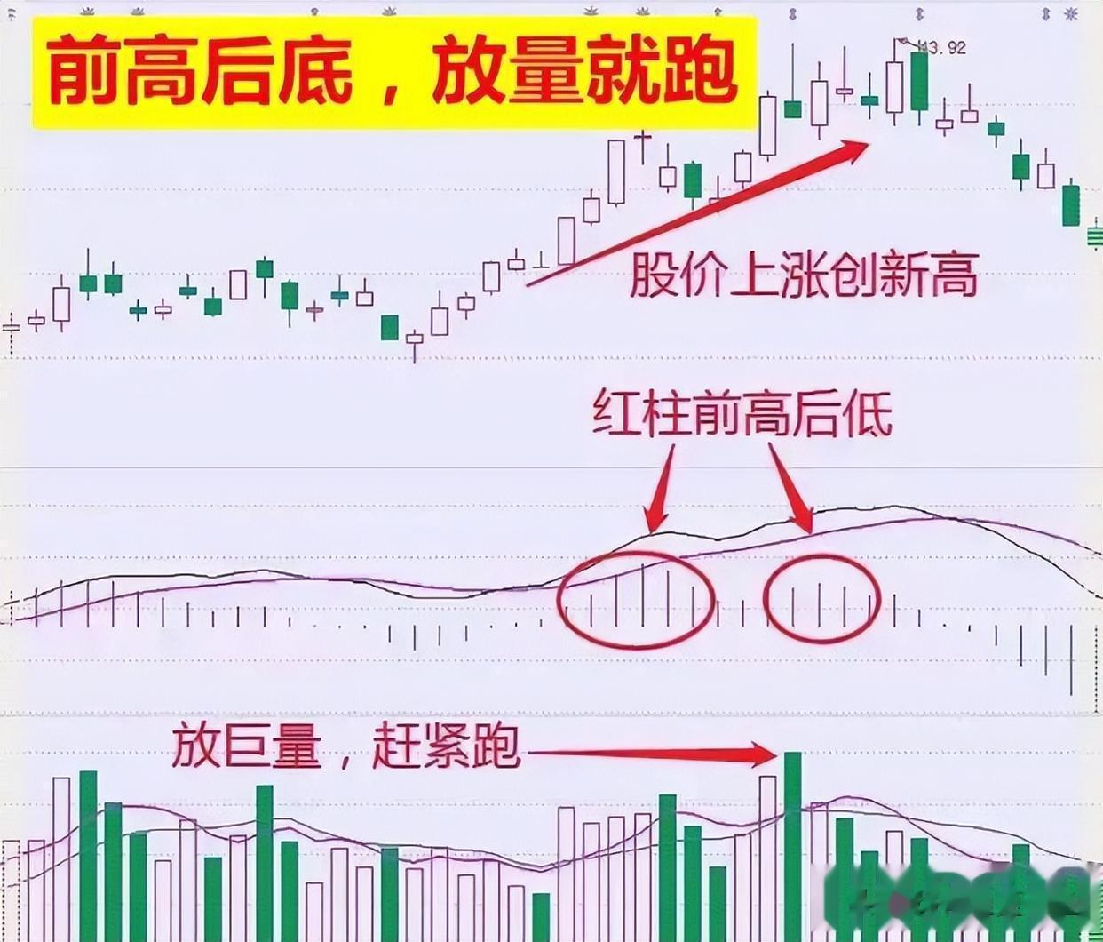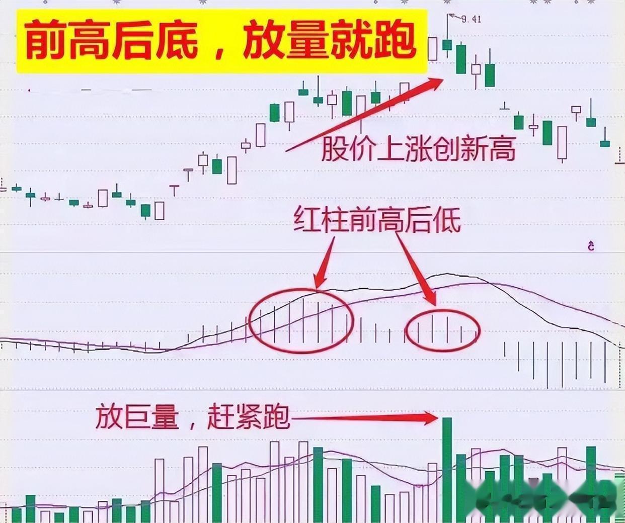 出局口诀:“前高后低,放量就跑”其实呢?这就是股价在上扬的过程中,股价不断地创新高,但是macd的能量柱逐渐地变小,红绿柱形成前高,后底的,且成交量放大,说明主力出逃,就是要离场的时候。