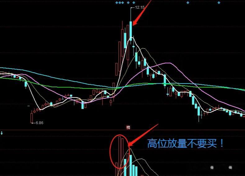 2、高位放量,高位放量滞涨的股票都不要买,高位一般是指经过三浪上涨的股票,后面的资金很难再进来接力了,大概率主力在诱多出货,前期的筹码出逃的迹象会比较明显,这时候进去容易买在山顶,出不来了。