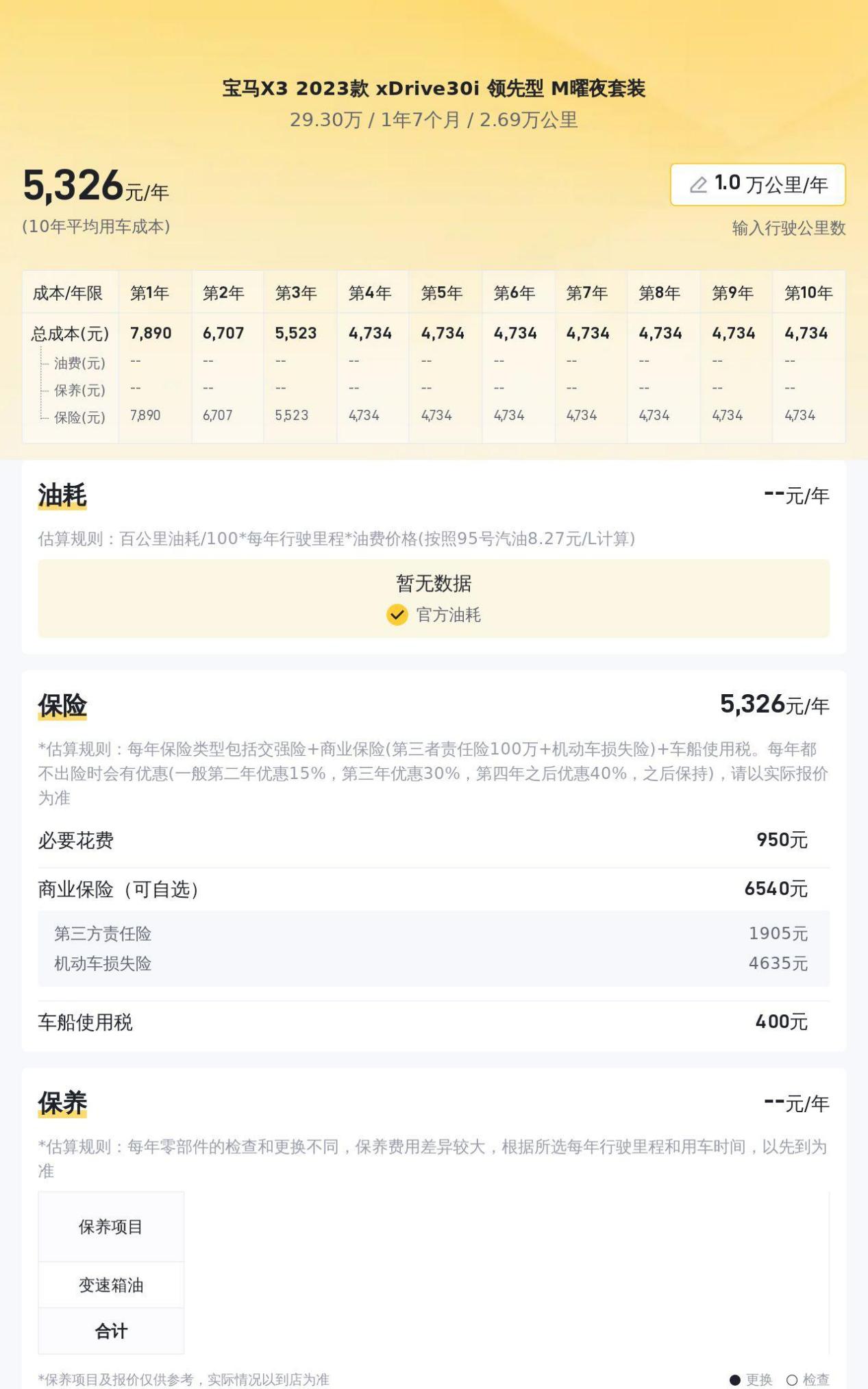 为了更直观地进行比较,我们假设购买一辆30万左右的合资品牌新SUV,首年保险费用大约在8000元左右,购置税大约在2.5万元左右,加上其他杂费,落地总价大概在34万元左右。而这台二手宝马X3,只需要29.3万就能直接开走,省去了购置税和其他杂费。