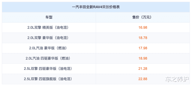 此次全新一汽丰田RAV4荣放共推出了6款车型,包含两款2.0L自吸版本和四款双擎动力版本,其中2.0L自吸车型分为两驱和四驱两款,官方指导价分别为17.98万和18.98万,限时优惠价16.18万和17.18万。双擎动力版本则分为2.0L双擎和2.5L双擎两款,其中2.0L双擎均为两驱版本,而2.5L双擎均为四驱版本,四款车型官方指导价分别为16.98万、18.78万、21.28万和22.88万,限时优惠价15.18万、16.98万、19.48万和21.08万。