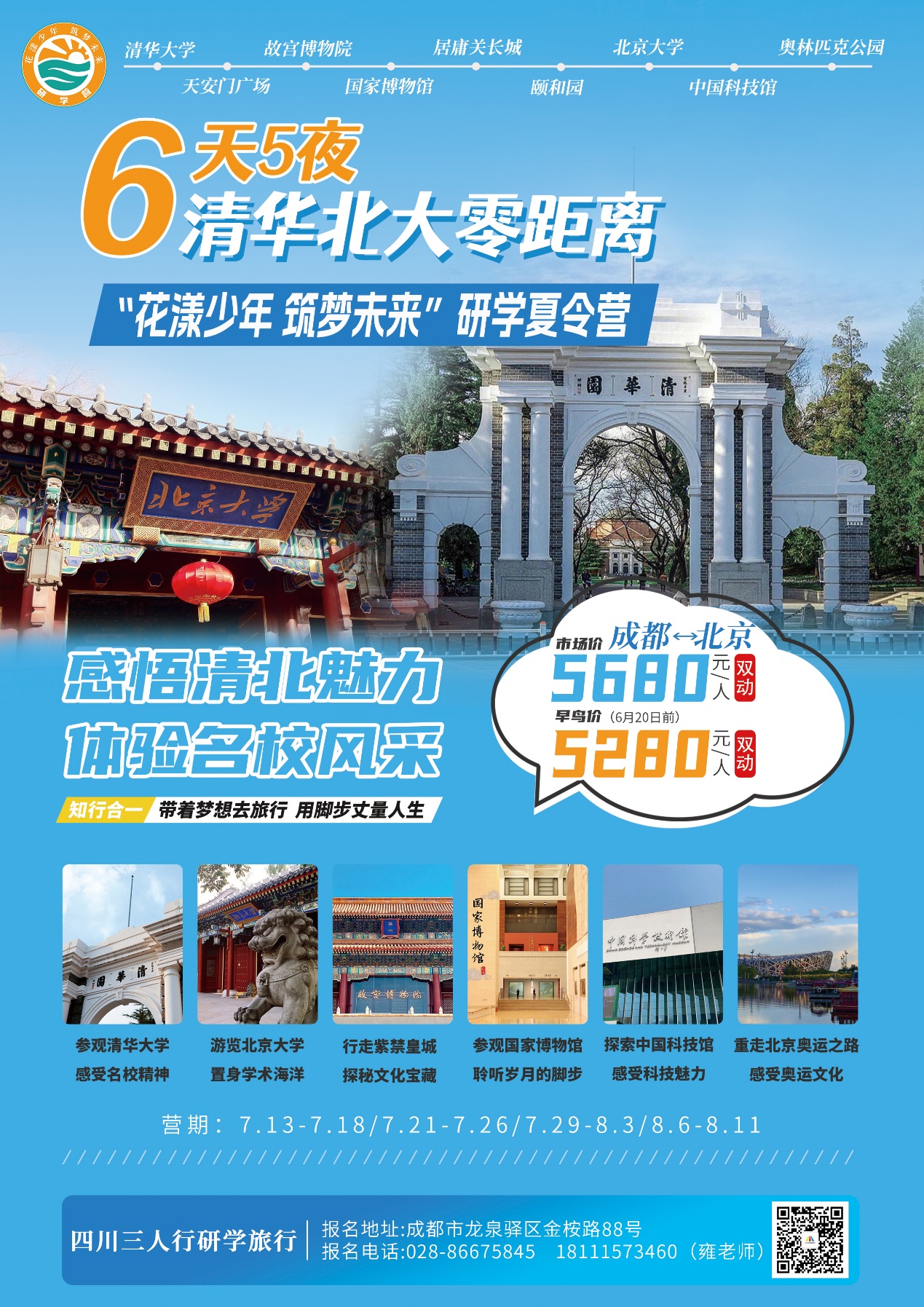 据了解, “花漾少年 筑梦未来”清华北大零距离研学夏令营由四川三人行研学旅行服务有限公司联合北京知名旅行社策划发起。项目整合清华大学、北京大学等名校名师文化资源,针对9至16岁青少年(3年级至8年级)身心成长特点、学业发展需要,创新采用任务型教学,将学科素养与研学旅行相结合,达到既研又学、边玩边学的效果,打造“行走的课堂”。