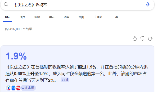 首播当日,《以法之名》便展现出惊人热度,收视率一路狂飙,实时收视峰值瞬间突破 1.9039%,毫无悬念地登顶同时段全频道收视榜首,在网络平台上,优酷预约人数突破 200 万大关,开播后播放量一路猛涨,在优酷悬疑剧热度榜、涉案剧热度榜中独占鳌头,灯塔全网剧集热度、微博剧集榜、微博娱乐榜、抖音剧集榜、猫眼剧集热度总榜等各大榜单中均名列前茅,成为当之无愧的 “霸榜王”。