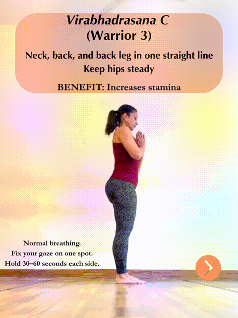 动作5,战士三式(Virabhadrasana C)