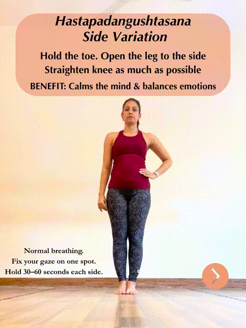 尽可能伸直膝盖。zhua 住大脚趾。正常呼吸。将目光固定在一个点上。每侧保持30 - 60秒。