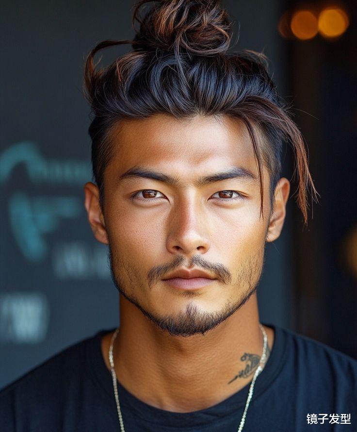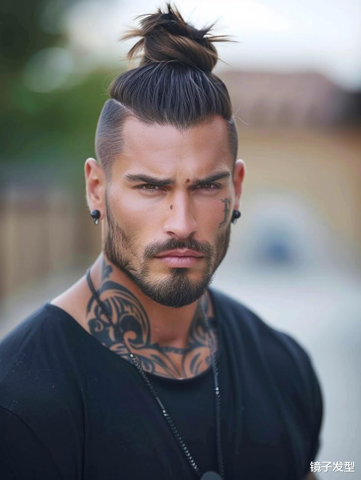这种发型将顶部头发高高束起,打造出一个紧实的丸子,不仅能够拉长脸部线条,使五官更加立体,还能展现出男士的清爽与干练。