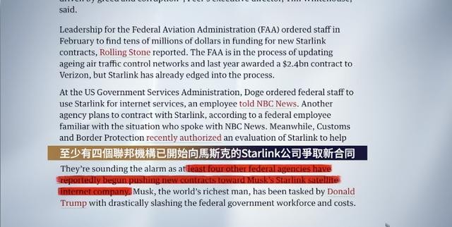 至少有4家联邦机构已经开始向马斯克的公司争取新合同,分别是美国国家海洋和大气管理局、美国联邦航空管理局、美国总务管理局以及海关和边境保护局。