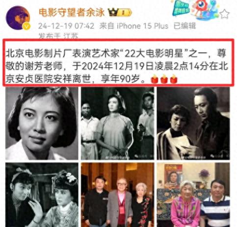【2】2024年12月19日发布 官方媒体 央视频《今天(12月19日)凌晨,电影《青春之歌》中林道静的扮演者、著名电影表演艺术家谢芳逝世,亭年89岁。老艺术家一路走好!》