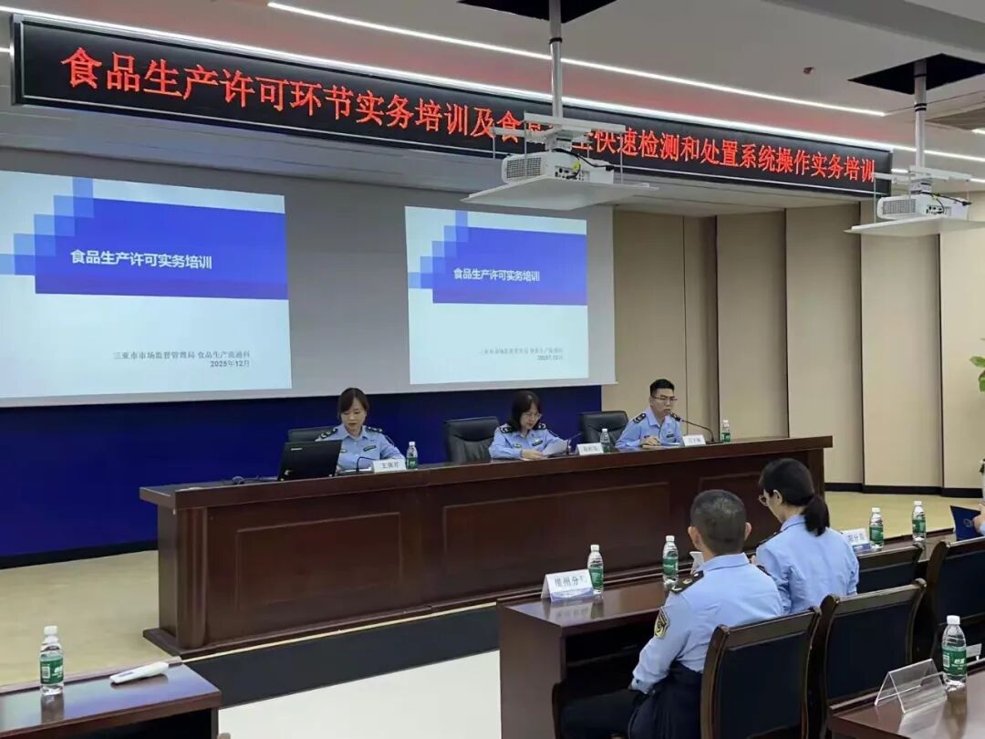 12月10日,三亚市市场监管局组织开展食品生产许可实务及食品安全快速检测与处置系统操作实务专题培训。各分局及监管所食品生产监管人员,与各农贸市场负责人、快检工作经办人员,以及配备快检室的超市相关负责人分批次参训。三亚市市场监管局党组成员、副局长陈利琛出席开班仪式并作动员讲话,强调此次培训对夯实食品安全监管基础、提升实操能力的重要意义。