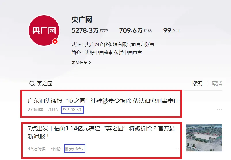 2025年5月17日,央视新闻也进行了标题为《估价上亿的违建“英之园”将被拆除 官方通报:严肃追责》的报道。
