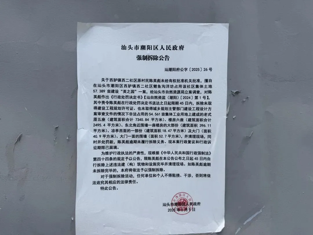 我们就说最近吧,最近时间的5月9日,汕头市潮阳区人民政府发布公告,要求“英之园”违建人陈英彪,“在45日内自行拆除非法占用54.561亩集体工业用地所建成的部分,否则,潮阳区人民政府将依法予以强制拆除。”