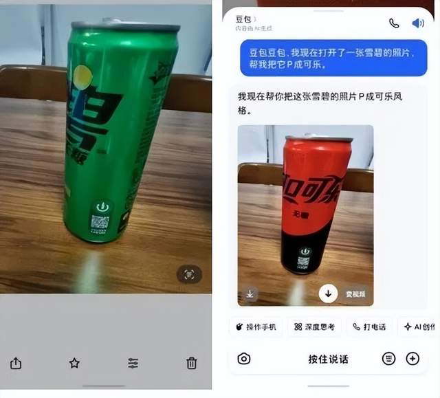当用户真正把豆包当作“代办者”时,它不仅能在助手层面完成流程交互,还能把AI的多模态能力渗透进日常操作。比如,豆包可以在相册中对指定图片直接进行“AI P图”,这一过程以往需要手动打开对应App。而原生豆包AI可以直接调用Seedream能力,完成“把这张雪碧图片P成可乐”的操作。