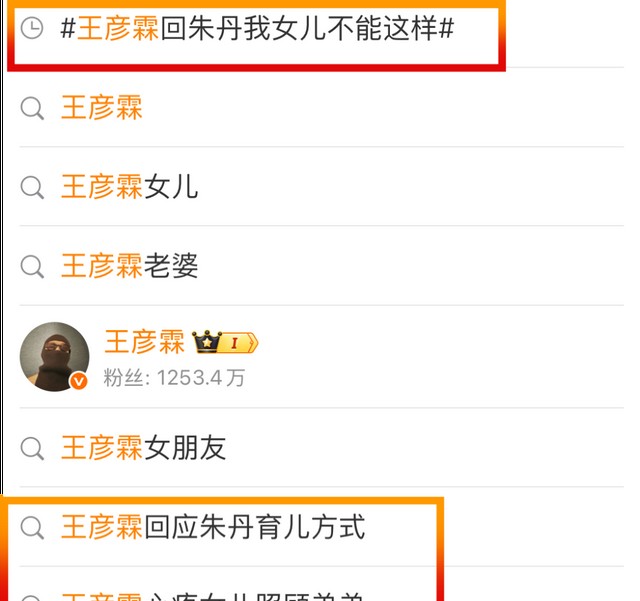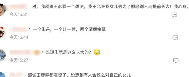 紧随其后的是词条“王彦霖回朱丹我女儿不能这样”登上热搜,大致意思是王彦霖看不惯朱丹让女儿照顾儿子的做法,觉得女儿太可怜了。