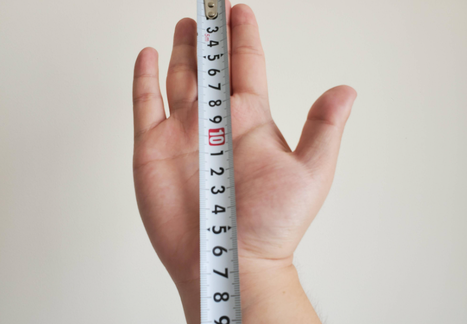 测量手掌大小的方法简单易懂。将你的惯用手平摊,五指自然并拢,从中指尖至腕横纹为长,从大拇指关节处至小指根部掌缘为宽,得到一个手部尺寸的基准值。如我之手,尺寸为17*10cm。