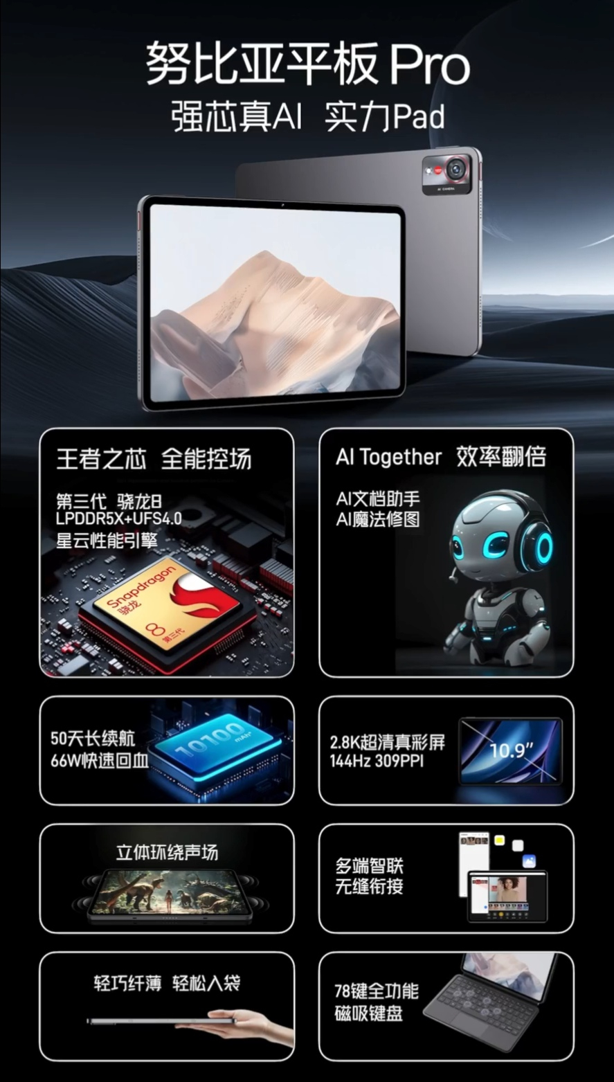 【努比亚平板Pro】它是努比亚首台平板,骁龙8 Gen 3,10.9英寸2800x1800的144Hz LCD屏幕(16:10,309ppi,840Hz瞬时触控采样率),10100mAh电池+66W快充。