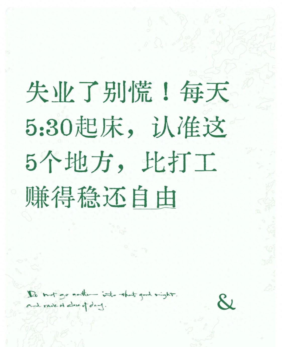 失业从来都不是人生的“终点”,只是换一种生活方式的“起点”。身边不少朋友失业后陷入焦虑,要么急着找一份凑合的工作,要么在家躺平内耗,其实完全没必要!现在的就业环境早就不是“只有打工一条路”,只要肯吃苦、找对方向,每天早起一点,找准这5个靠谱的“增收阵地”,不用看老板脸色,不用被考勤束缚,赚得比上班还稳,还能享受时间自由,很多人靠这些方式已经实现了收入翻倍。