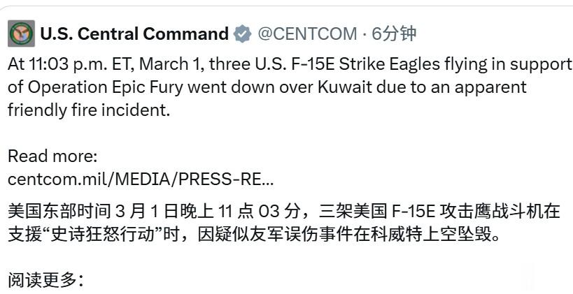 几乎在卡塔尔击落伊朗战机的同一时段,中东战场的另一处传来更令人震惊的消息,3架美军F-15E“打击鹰”重型战斗机在科威特上空坠毁。这起事故迅速引发全球关注,而各方给出的说法却大相径庭。