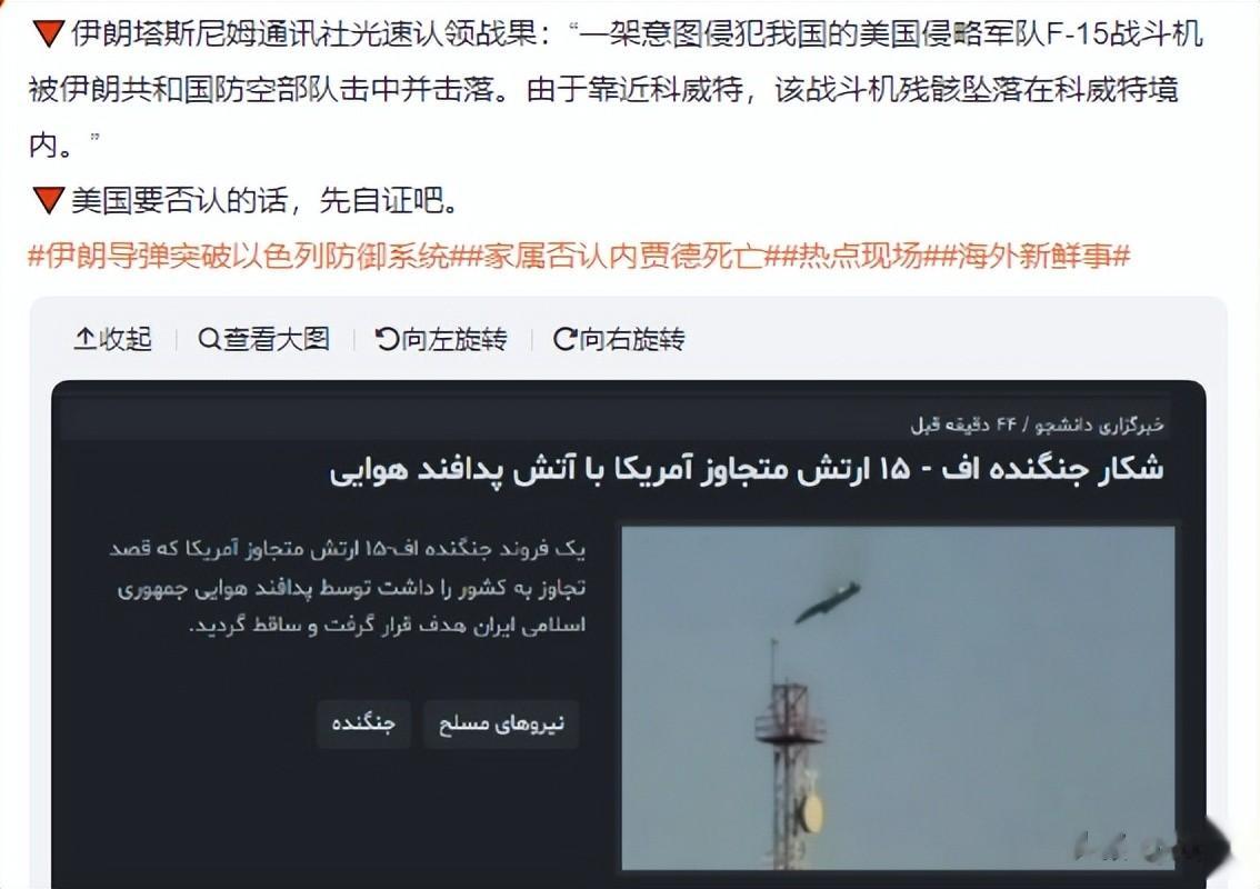 然而,伊朗方面却给出了完全相反的说法。伊朗哈塔姆・安比亚中央司令部当天发表正式声明,高调宣称这3架F-15E战机是被伊朗防空系统精准击落的。伊朗国家电视台也同步报道,伊朗军方发言人强调,这些美军战机试图侵犯伊朗领空,伊朗军队依法实施自卫,成功摧毁了来袭目标,残骸最终坠落在科威特境内。