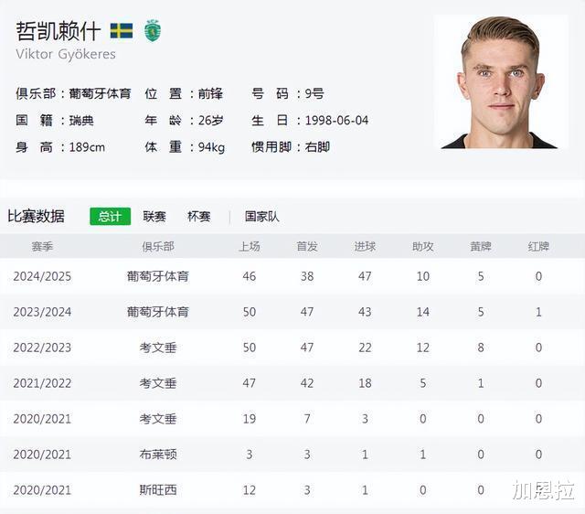 到现在这个赛季,哲凯赖什在46场比赛里一共参与了57个进球,他自己就进了47个,还助攻了10次。他现在在葡超的射手榜上排第一,并且也是欧洲金靴奖的大热门人选。