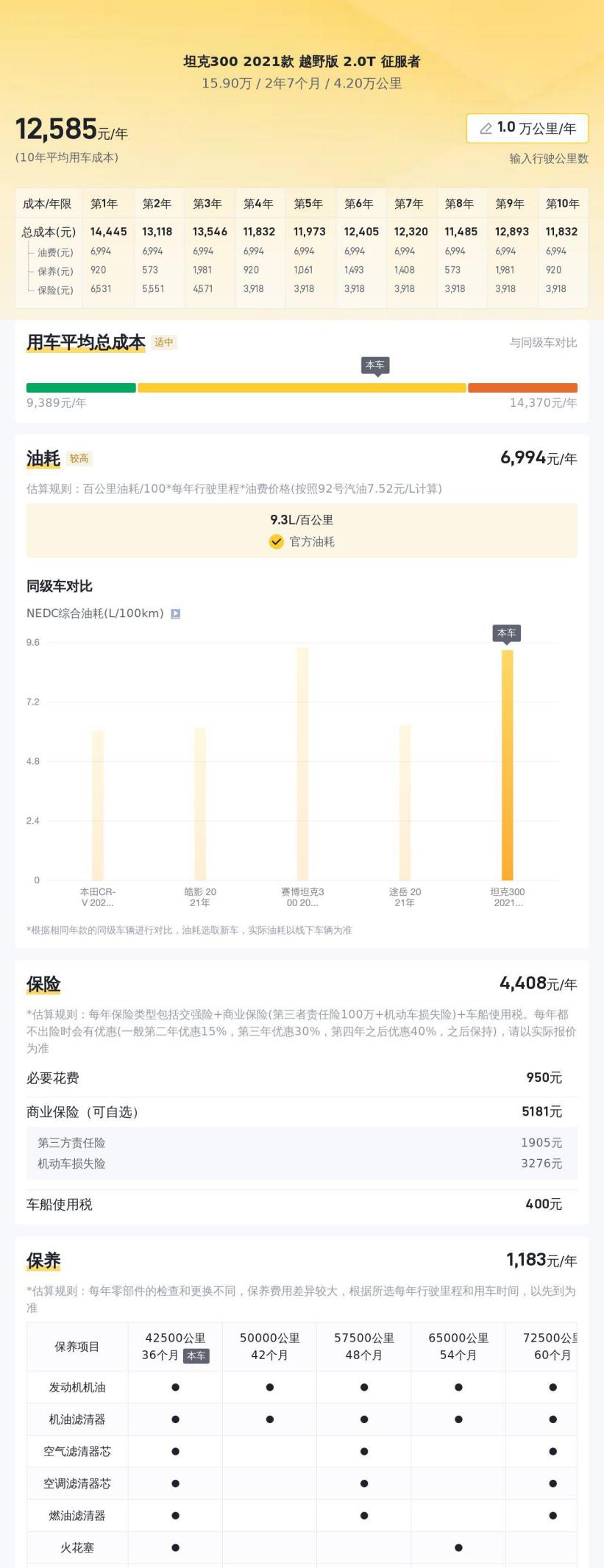 再来说用车成本。除了油耗,还需要考虑保养、维修、保险等费用。坦克300的零部件价格相对较高,维修费用也比普通家用车要贵。再加上这辆车已经开了三年,未来可能会面临一些零部件老化的问题,这都需要一笔额外的支出。