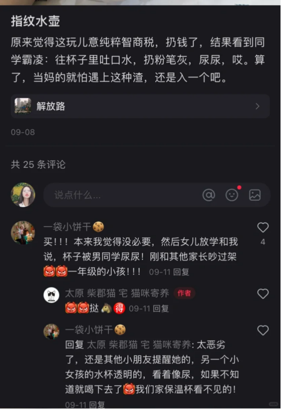 网友1:之前觉得这玩意儿纯属智商税,但看到同学霸凌,往杯子里面扔口水、粉笔、甚至尿尿……,感觉好像也不差这点儿钱了!!保命重要!