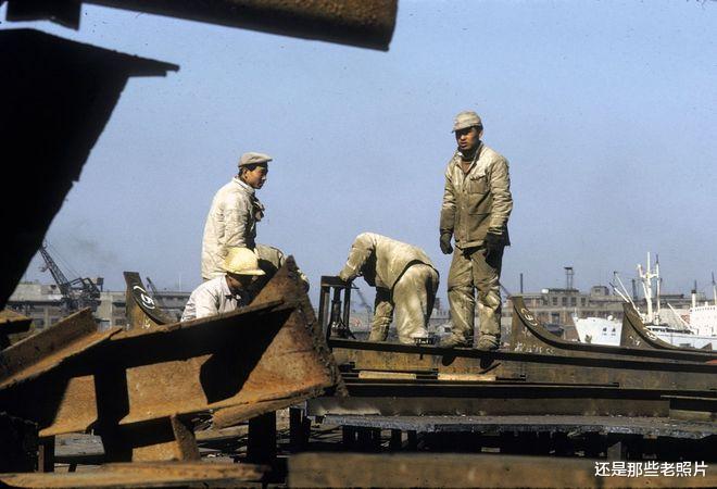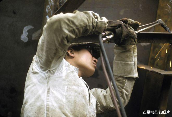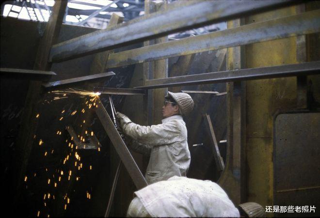 1972年,上海造船厂的焊工,正在辛勤工作中,他们一身的油污。